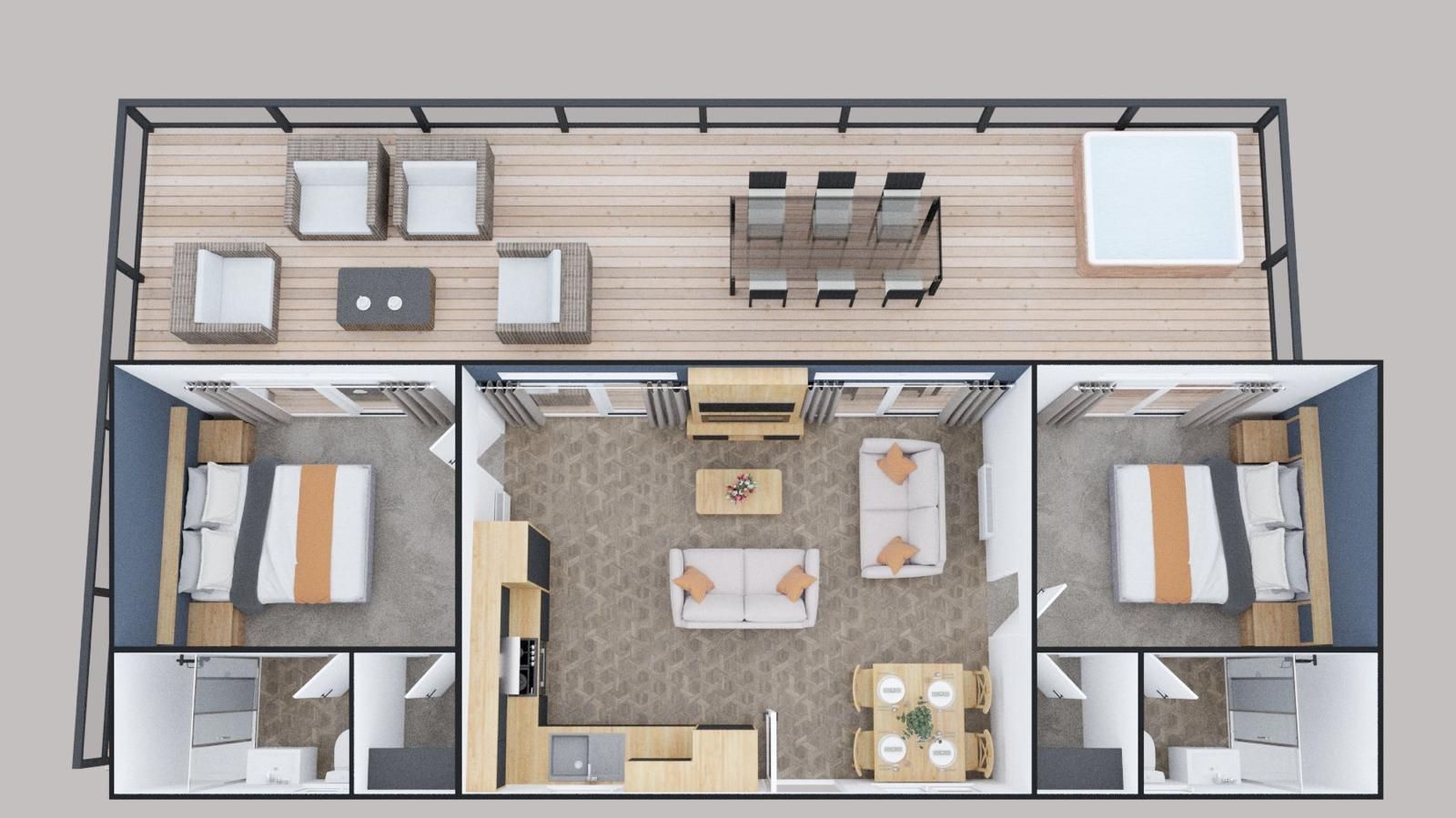 Two king size master bedrooms either end will both have an ensuite and a walk in wardrobe and will both benefit from their own sliding patio door out onto the bespoke decking.